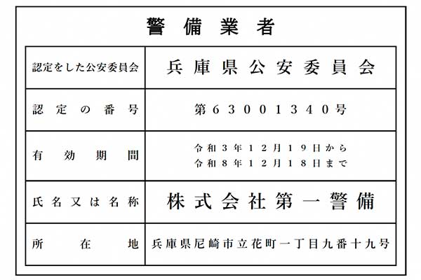 | 許可 | 兵庫県公安委員会 第63001340号 令和3年12月19日から令和8年12月18日まで |